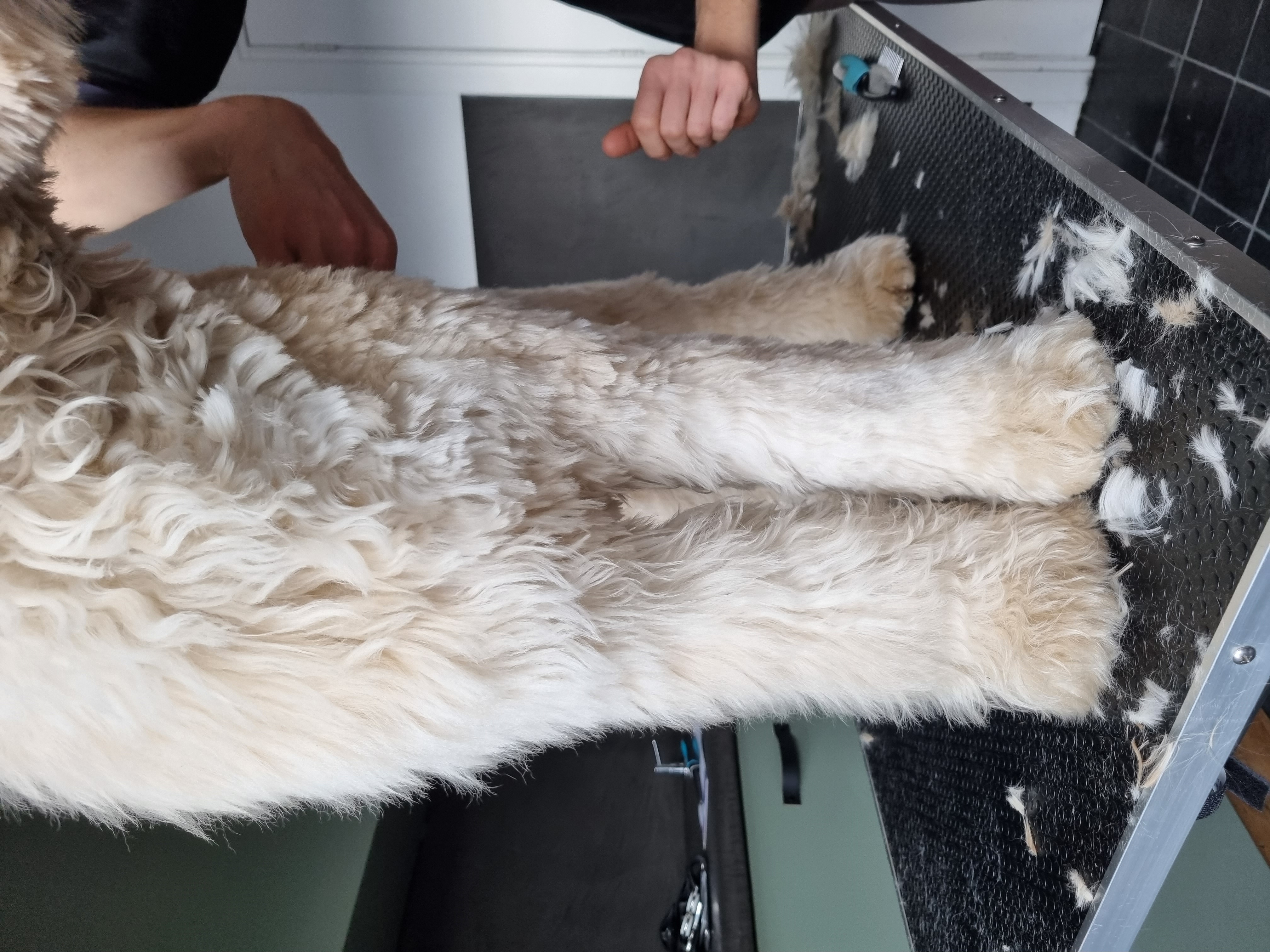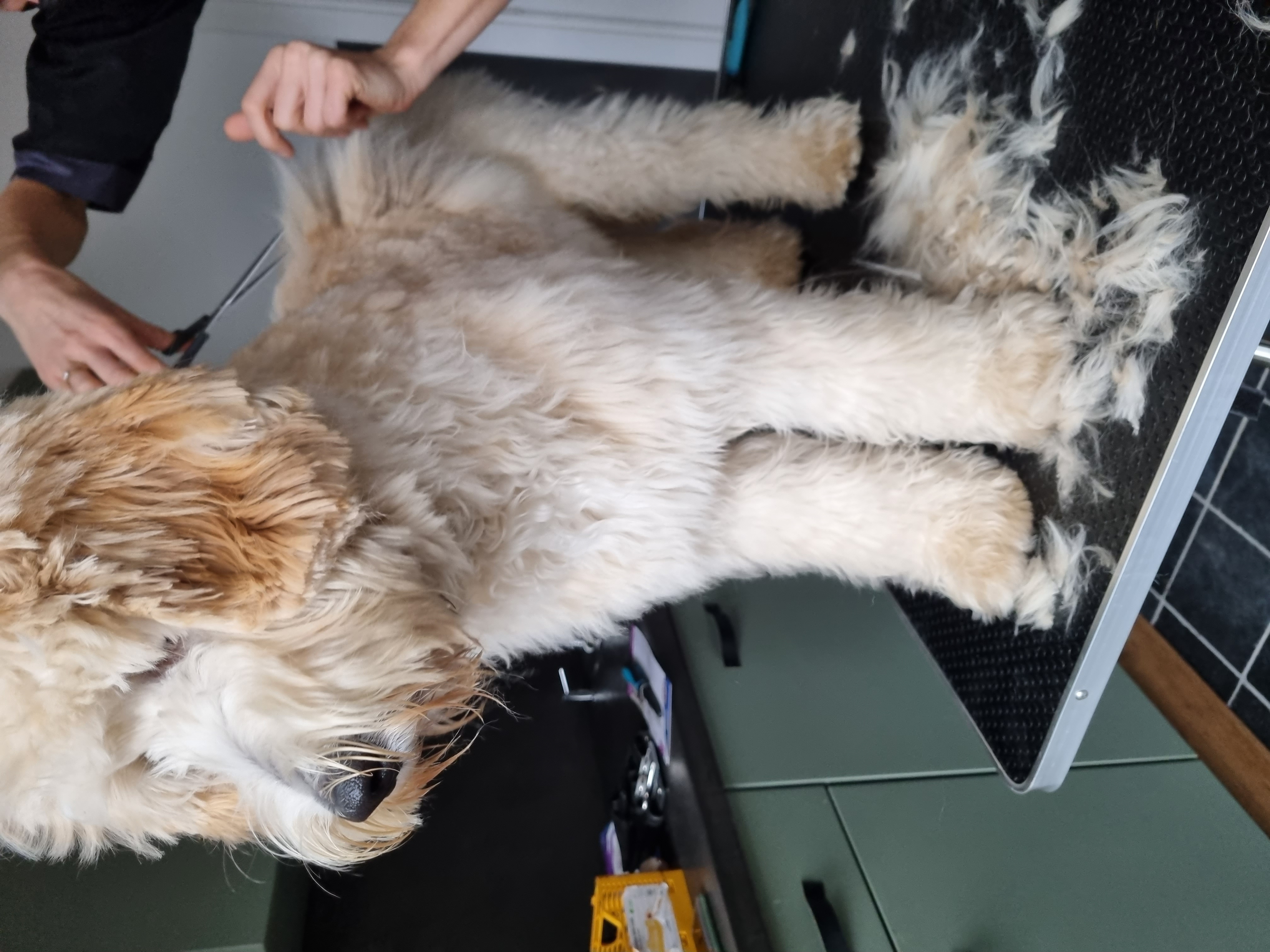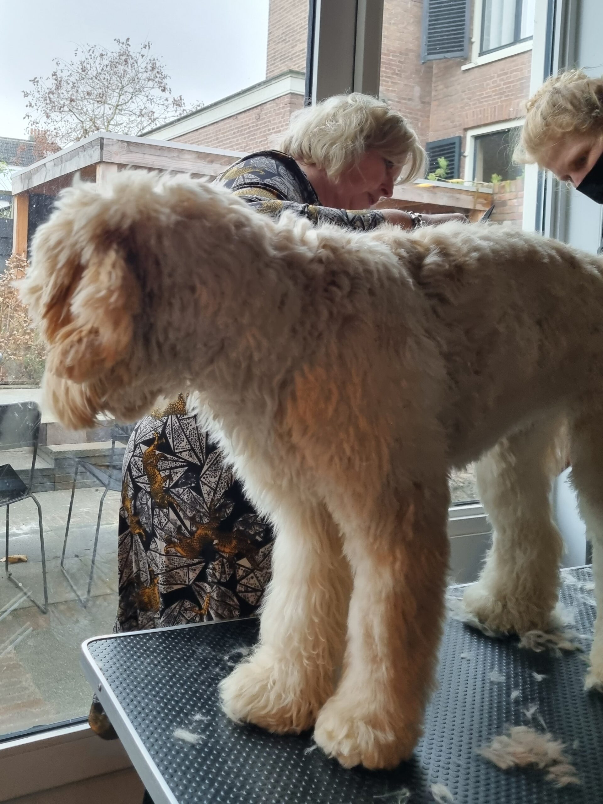 Ja echt, vandaag was Bobbi’s eerste trimbeurt. Niet zomaar een trimbeurt, nee een trim workshop voor de baasjes. Vrouwtje had gelezen dat er een workshop labradoodle trimmen was en had dat dus geregeld. Het leek de baasjes handig en leuk dat ze het zelf zouden leren. Natuurlijk ook makkelijk voor de baasjes omdat ze geen afspraken hoeven te maken met volle trimsalons. Vandaag was het dan zover. Vanmorgen eerst vroeg op pad naar Debby van Doodle hair do. Daar aangekomen werd ik eerst geborsteld terwijl de baasjes aan de koffie zaten. Baasjes bleken me wel goed geborsteld en geblazen te hebben de afgelopen maanden.