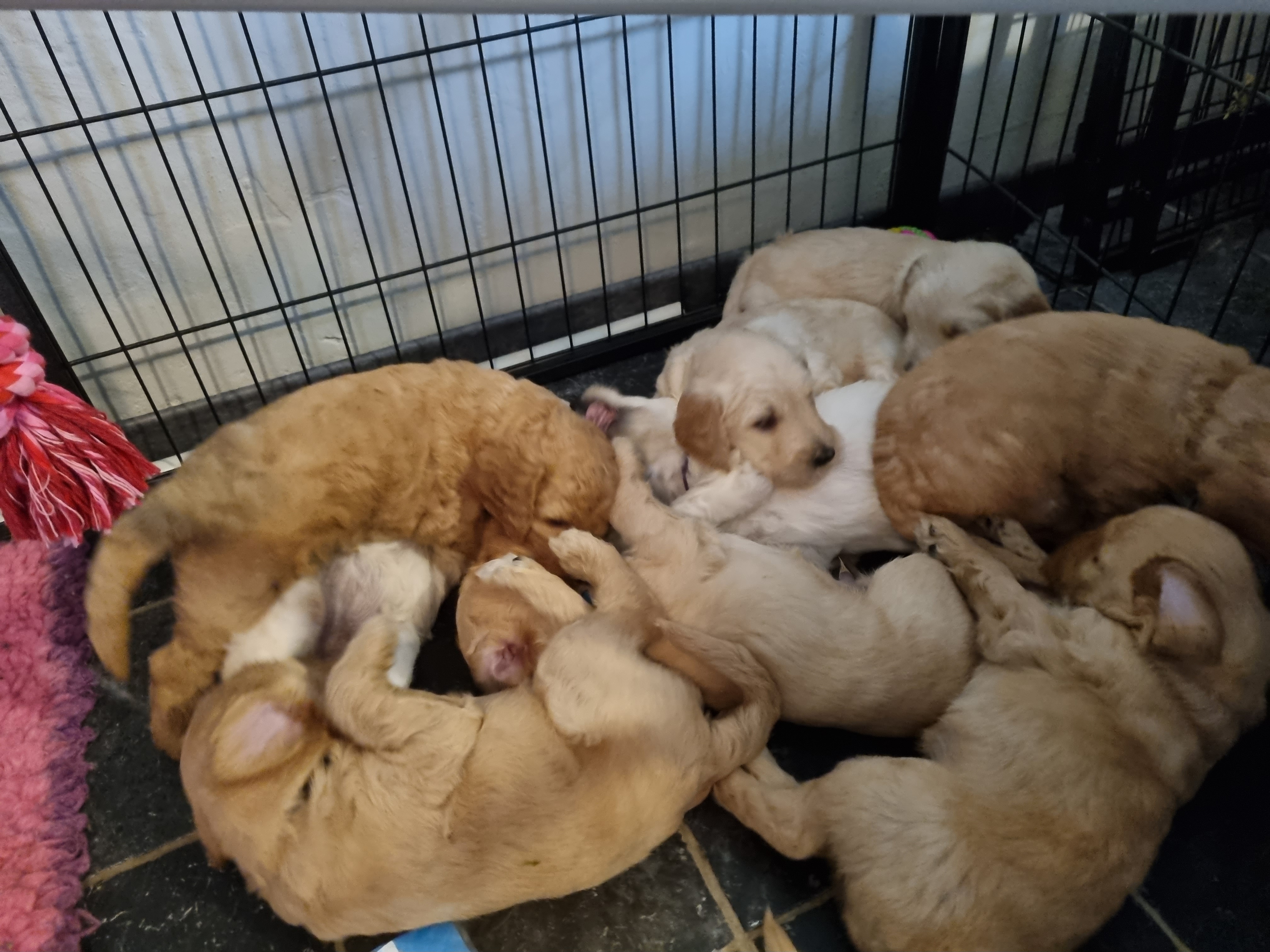 Deze pupdate van 5 juni is weer een pupdate over mij Bobbi en mijn labradoodle broertjes en zusjes. Vandaag kwamen mijn baasjes langs dus zijn we weer allemaal op de foto gegaan. Met ons gaat ie supergoed, met mama iets minder, die is een beetje moe door ons. Ik ben ondertussen over de 2 kilo en ik kan al lopen. Wat nog beter gaat is jaja slapen maar ook dollen en spelen met mijn broertjes en zusjes. Hieronder zie je een aantal foto’s van mij en mijn broertjes en zusjes.