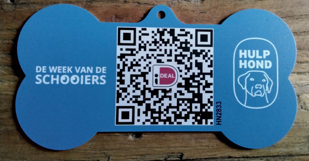 Dan heb ik nog een dingetje. Binnenkort ga ik schooien met de baasjes voor hulphond.nl in de week van de hulphond van 4 tm 10 oktober. Ik heb er nu al zin in en mijn schooispullen zijn al binnen. Scan je de qr code van mijn halsband bot dan kun je eenmalig doneren.