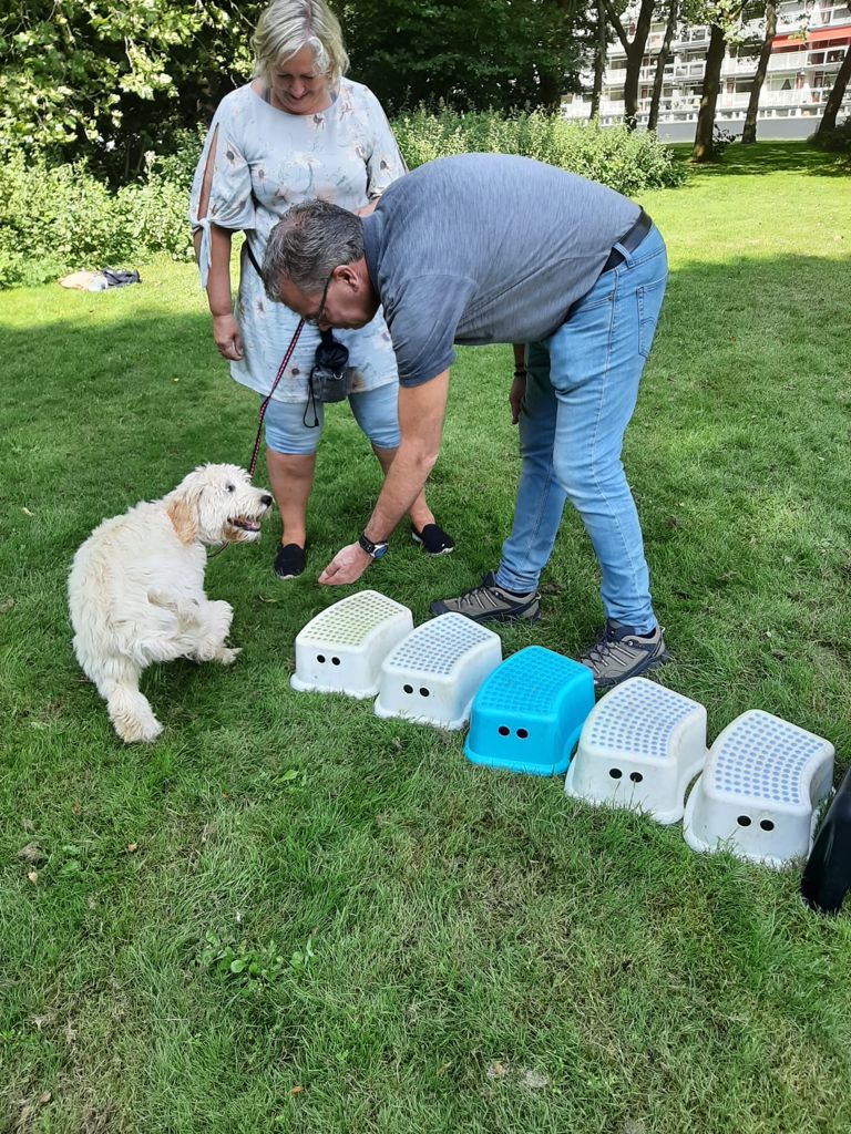Als afsluiter moesten we ook nog over allerlei krukjes lopen. Lastig joh, mijn pootjes leken wel elk hun eigen leven te leiden. Leek wel een zwalkoefening. Maar de baasjes maar snoepjes neerleggen. Ik ze volgen en zo kwam ook die oefening weer goed. Zo was de puppycursus met beide baasjes bij Leren kan anders hondentraining was weer supergaaf.