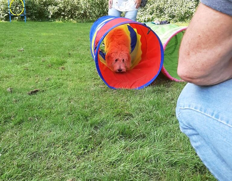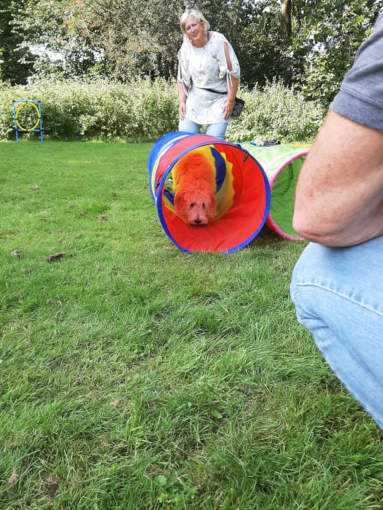 Vandaag was het de 3e cursusdag en ik was benieuwd wat er komen zou. Komen we op het veld liggen daar van die gave dingen om doorheen te gaan. Daar heb ik vaak met mijn broertjes en zusjes mee gespeeld. Ik had dus gelijk zin in deze oefening. Natuurlijk wel eerst beetje dom doen, want dan komen de snoepjes! Ik vind dit soort speeltjes echt gaaf. Ze noemen het een hondentunnel, maar er zijn meer gave speeltjes voor buiten. Ik hoop dat de baasjes de speeltjes hieronder voor me kopen. Zoooo gaaf. Lekker bezig zijn buiten heerlijk.